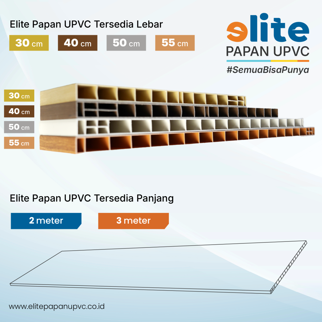 Elite Papan UPVC hadir dengan pilihan dimensi yang fleksibel untuk berbagai kebutuhan proyek Anda. Tersedia empat varian lebar — 30 cm, 40 cm, 50 cm, dan 55 cm — dengan panjang 2 meter dan 3 meter.